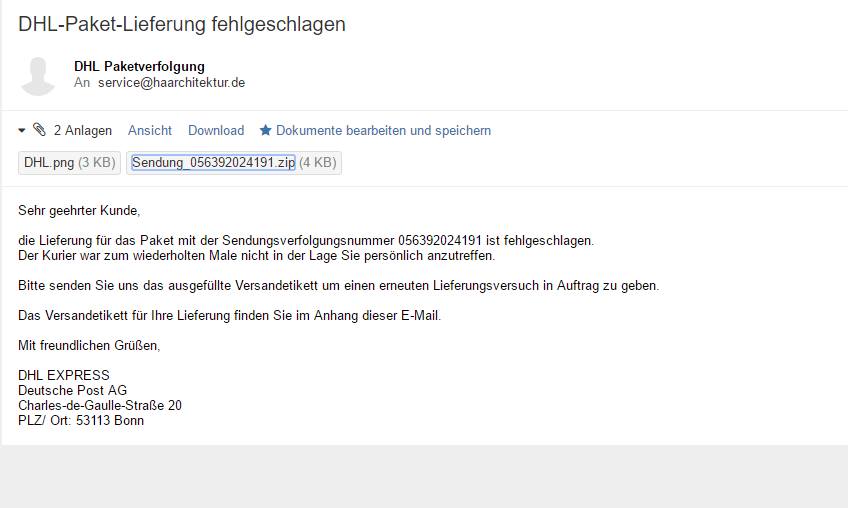 Getarnt als Bewerbung mit den Bewerbungsunterlagen auf einer Dropbox hinterlegt, oder auch im Anhang als ZIP.Datei (Bewerbung.doc.js|Lebenslauf.doc.js) getarnt oder als angebliches Schreiben der DHL, (angeblich konnte ein Paket nicht zugestellt werden) auch hier ist eine Zip.Datei mit dem Inhalt als getarnte PDF´s, welche sich bei genauerer Ansicht als Java Skript File herausstellen und die gesamten Daten auf dem Computer und im Netzwerk verschlüsseln können. Danach erhält man dann Kontakt von Erpresser, die einem anbieten die Daten nach einer Zahlung wieder zu entschlüsseln.