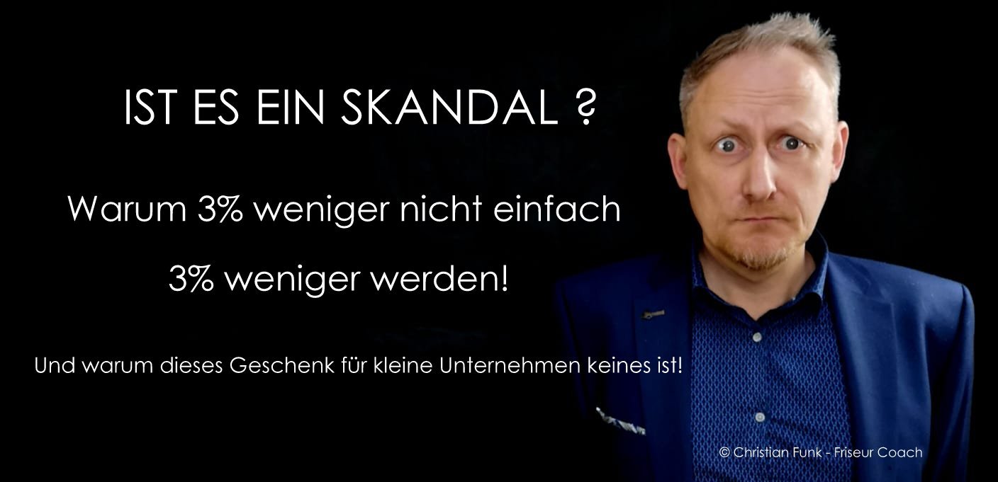 Eine der wohl zurzeit häufigsten Fragen, die mir von Kunden, aber auch von Friseurkollegen gestellt wird und die leider bei einigen auch zu Diskussions- und Streitsituationen führt – ist die: Warum wird nicht auch der Preis um 3% gesenkt, wenn die MwSt. um exakt 3% herabgesetzt wird?